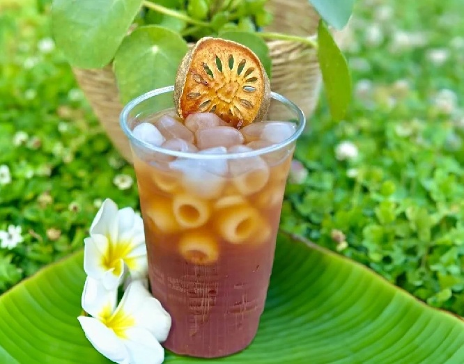 A slightly sweet, refreshing and earthy iced tea made by Chef Supa from Bael fruit.