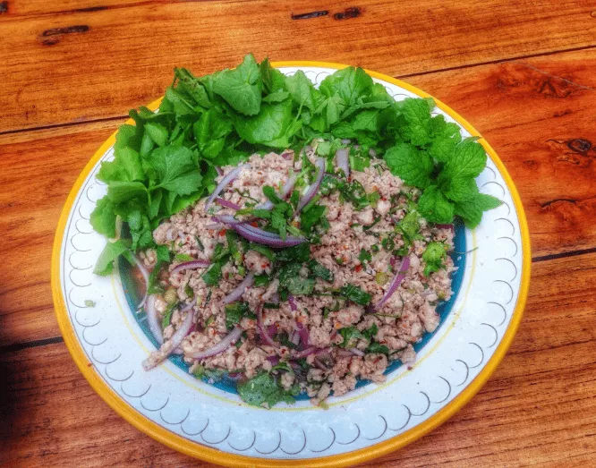 Minced (not ground!) chicken breast spiced with fish sauce, lime juice, Thai chilis and shallots, tossed with roasted ground rice and topped with mint, scallion and cilantro.