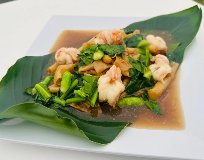 Thickened and soupier wide rice noodles with garlic, fresh vegetables, oyster sauce, black soy sauce and soy beans. Served with your choice of protein.